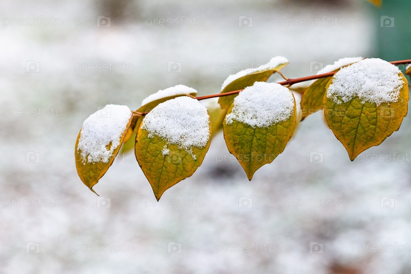 Первый снег на желтых листьях дерева крупным планом