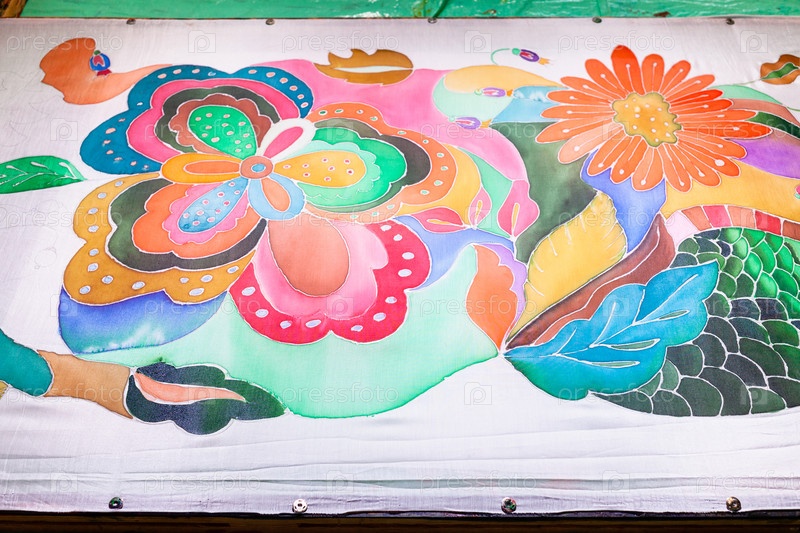 Шелковый батик с растительным орнаментом на деревянной раме