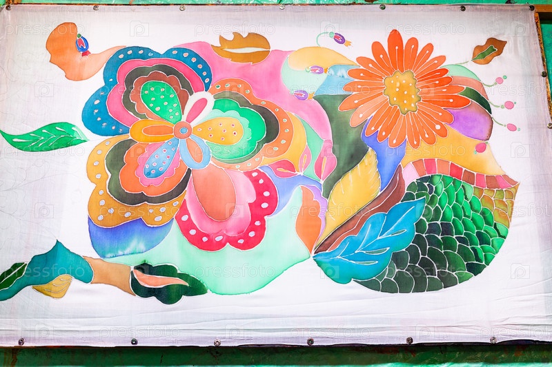 Шелковый батик с цветочным узором на деревянной раме