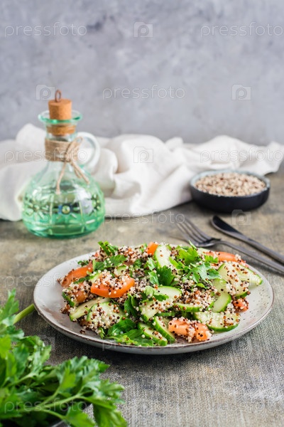 Домашний салат из огурцов, помидоров, смеси киноа и зелени на тарелке на столе