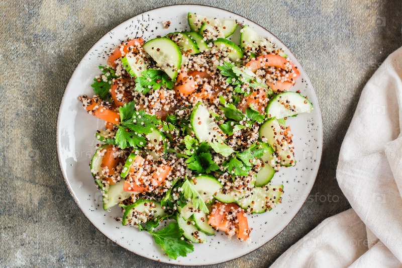 Аппетитный салат из огурцов, помидоров, смеси лебеды и петрушки на тарелке на столе