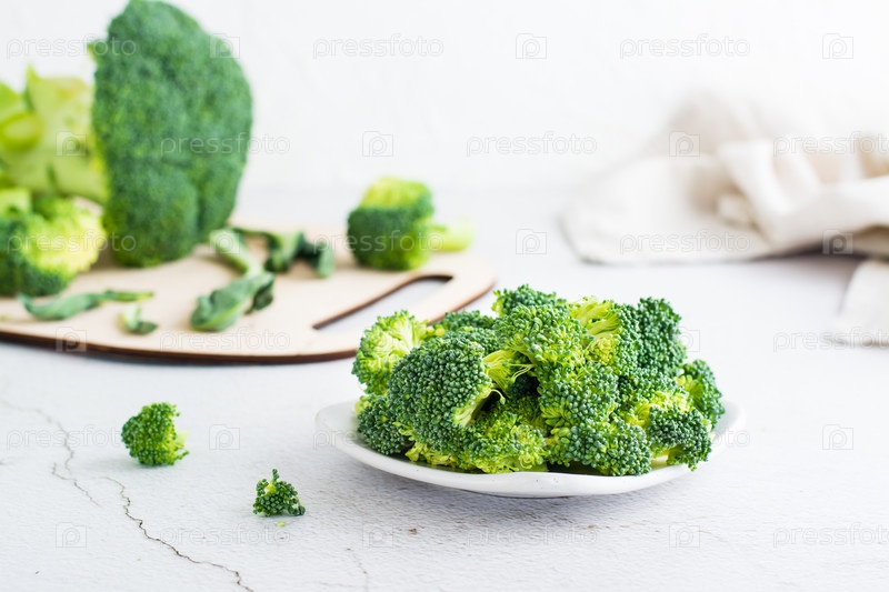 Кусочки сырой брокколи на тарелке на светлом столе