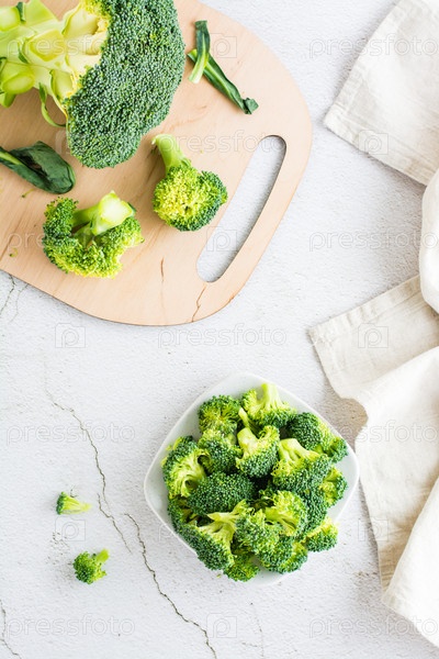 Кусочки сырой брокколи на тарелке на светлом столе. Верхний и вертикальный вид