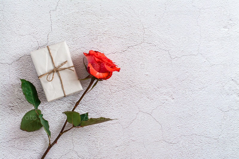 Свежая красная роза и эко-упакованный подарок на сером фоне текстуры. Вид сверху