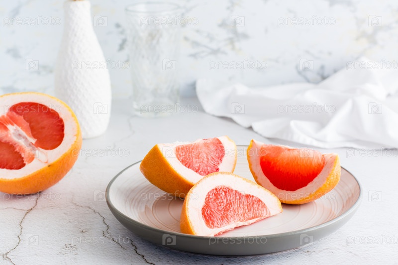 Спелые ломтики грейпфрута на тарелке на светлом столе. Устойчивый образ жизни