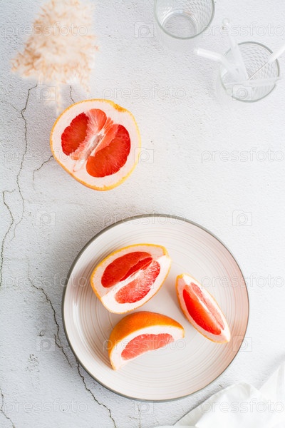 Кусочки сочного свежего грейпфрута на тарелке на светлом столе. Витаминное диетическое питание. Верхний и вертикальный вид