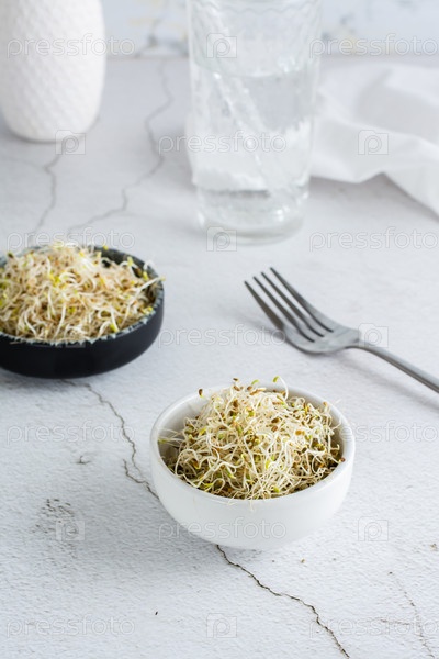 Свежие ростки клевера и люцерны для еды в миске на светлом столе. Детокс органическая диета. Вертикальный вид