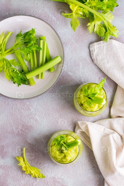 Два стакана со свежим сельдерейным смузи и ингредиентами для приготовления пищи на столе. Вегетарианская диета для детоксикации. Верхний и вертикальный вид