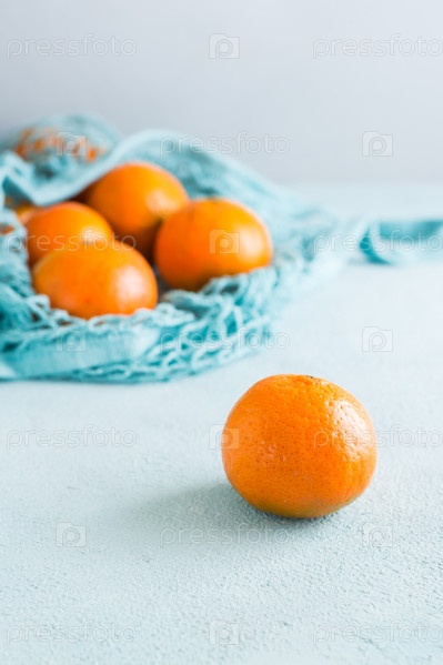 Спелые мандарины в сетчатом мешке на синем фоне. Фрукты в экологичной упаковке. Вертикальный вид
