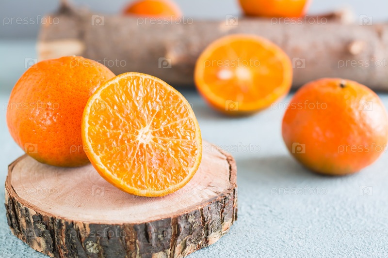 Спелый мандарин, разрезанный пополам на спиле дерева, и мандарины рядом на синем фоне. Экологически чистые фрукты. Крупный план