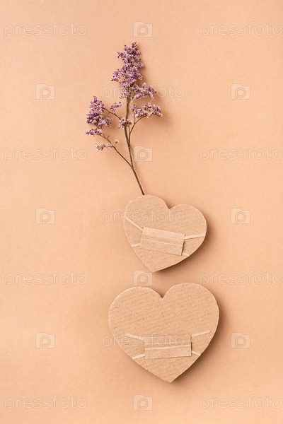 Концепция даты пандемии. Два замаскированных картонных сердца с сухим цветком вместе на бежевом фоне. Вид сверху и вертикальный. День Святого Валентина