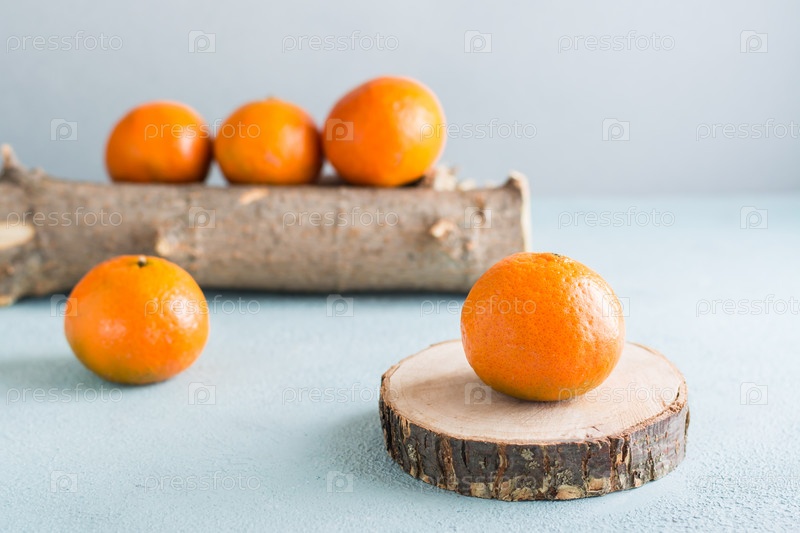 Спелые мандарины на срезе дерева и мандарины на бревне на синем фоне. Экологически чистые фрукты