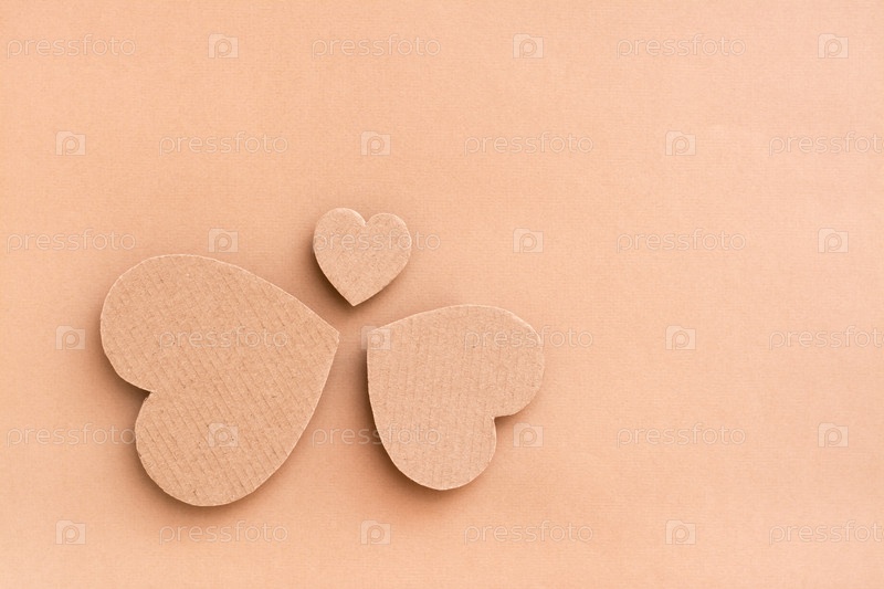 Концепция семьи. Три картонных сердца - папа, мама и ребенок стоят в кругу на бежевом фоне. Вид сверху