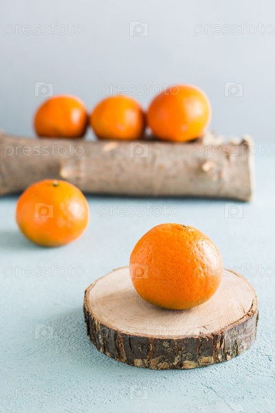 Спелые мандарины на срезе дерева и мандарины на бревне на синем фоне. Экологически чистые фрукты. Вертикальный вид
