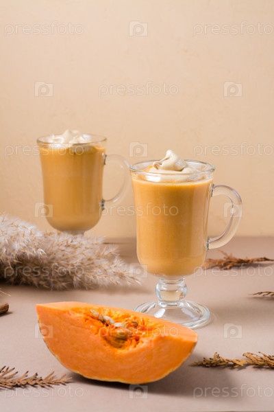 Тыквенный взбитый кофе с корицей в стаканах и ломтик тыквы на бежевом фоне. Осенние горячие домашние напитки. Вертикальный вид