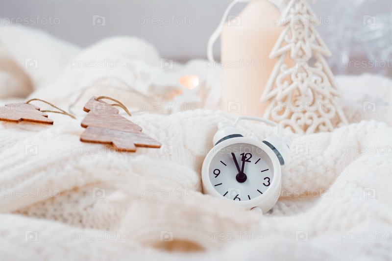 Концепция обратного отсчета в рождественскую ночь. Белый будильник, елка и свеча на белом вязаном свитере