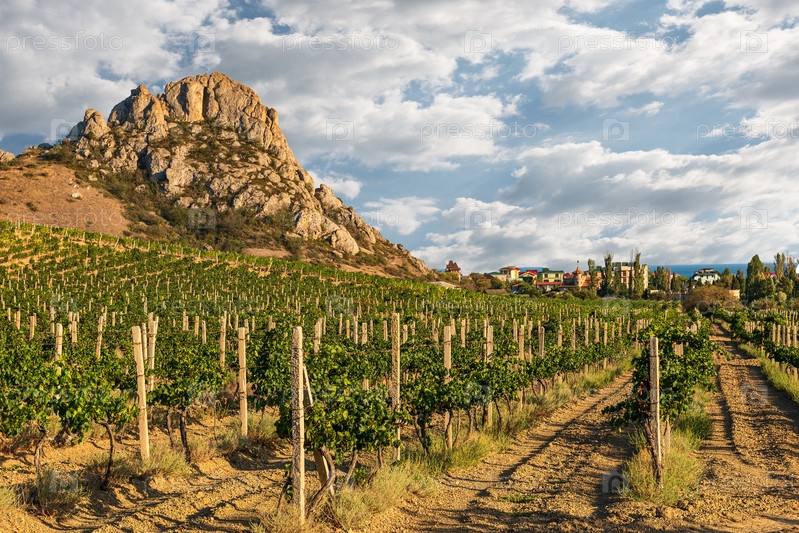 Пейзаж крымских гор с растущими на них виноградниками у поселка Курортное с видом на гору Бал Кая