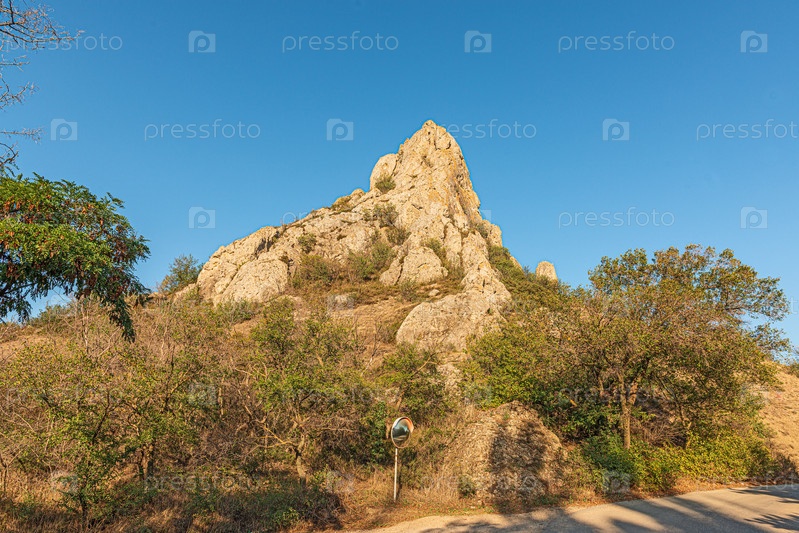 Пейзаж крымских гор, местная достопримечательность гора Бал Кая в поселке Курортное, днем гора служит ориентиром и маяком