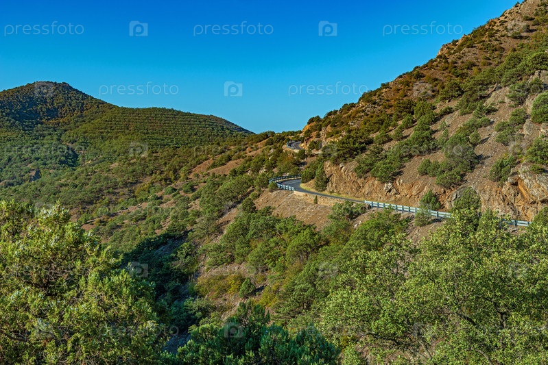 Пейзаж крымских гор, в яркий солнечный день, покрытый мелким кустарником, с проходящей через него трассой, серпантином