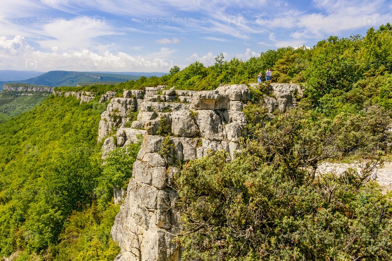 В горах Крымского полуострова туристы с высокой скалы любуются дикой природой