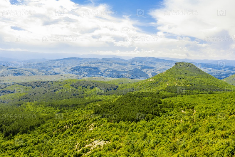 Пейзаж гор и долин Крымского полуострова с видом на гору, напоминающую пирамиду
