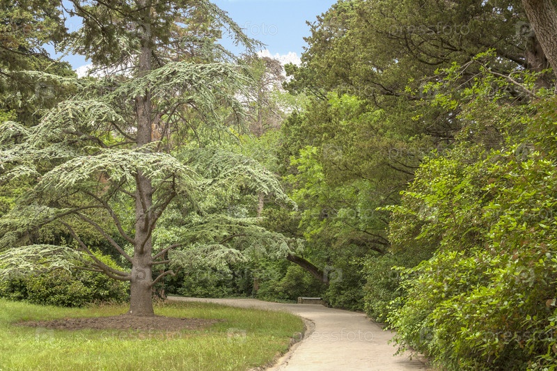 Красивая благоустроенная аллея, пешеходная дорожка, зона для прогулок и отдыха в парке в Крыму