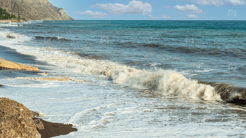 Морской пейзаж, ветер подхватывает волну на море и у берега вода смешивается с песком и галькой, волны бегут по берегу и пенятся