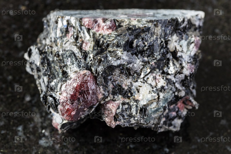 Необработанные красные кристаллы граната в биотитовой породе на черном
