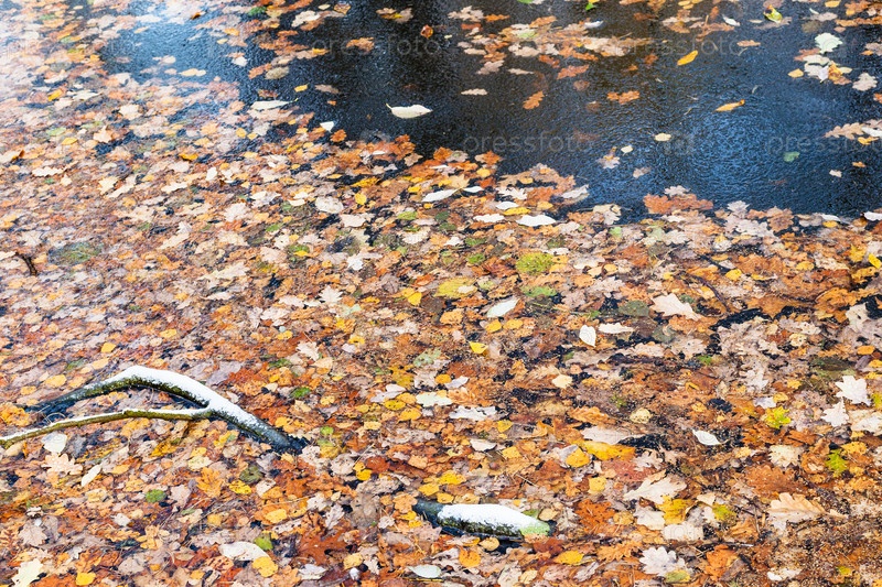Много опавших листьев в замерзшей воде лесной реки