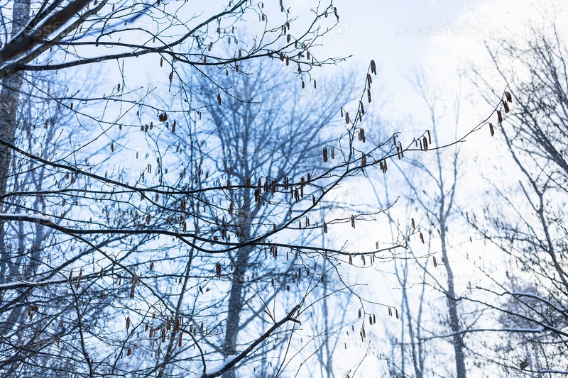 Вид снизу ветвей ольхи с сережками