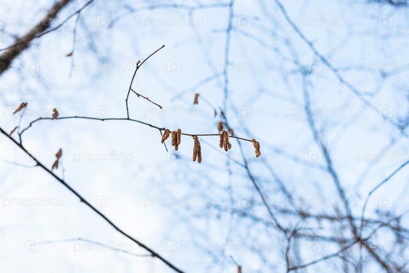 Веточка ольхи со свежими сережками и голубым небом