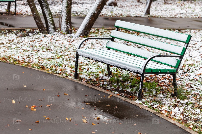 Первый снег на деревянной скамейке в городском парке