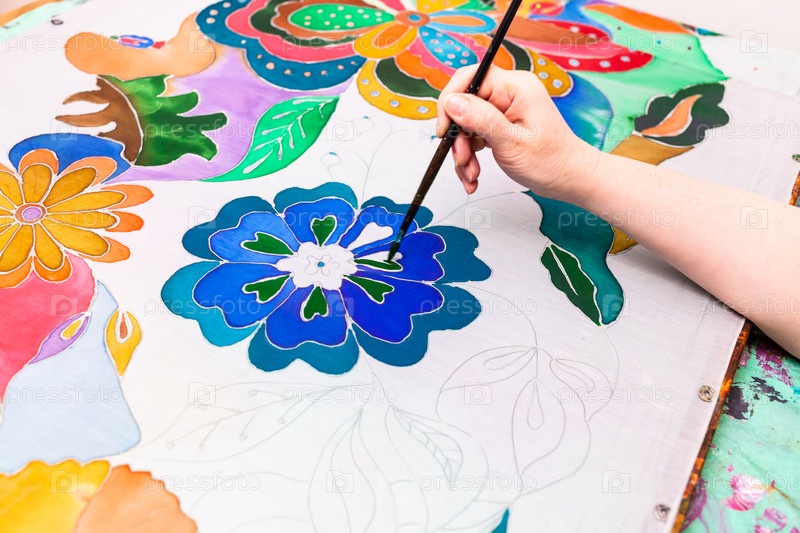 Мастер рисует батик цветочным узором на шелке
