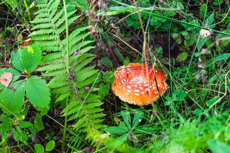 Вид на мухомор на зеленом лугу