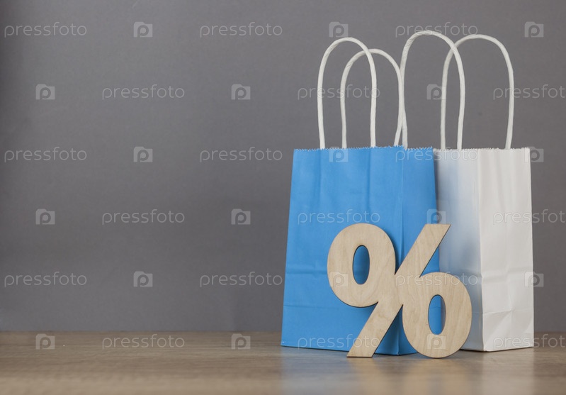 Концепция идеи интернет-магазинов электронной коммерции. Красочные бумажные хозяйственные сумки и процент знака на деревянном столе. Клиент, покупающий товар/услугу через Интернет. Скопируйте пространство