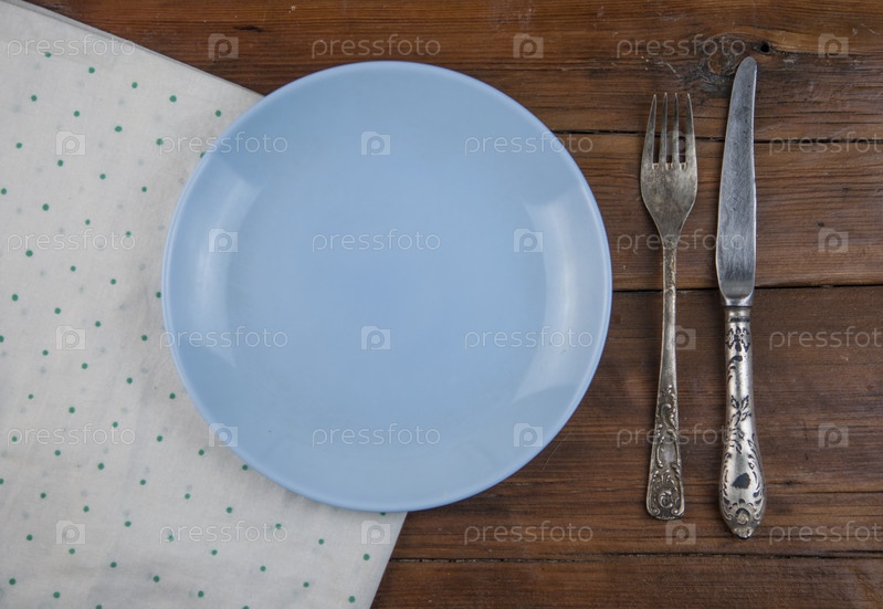 Сервировка стола. Пустая тарелка, нож, вилка и салфетка. Вид сверху и плоская планировка с копией пространства