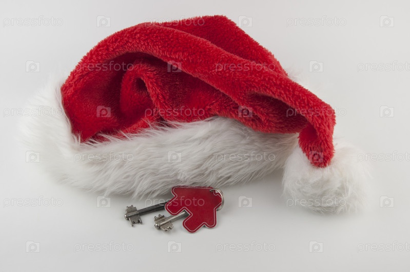Рождественские украшения: декоративный дом с ключом от замка и шляпой Санты на фоне белой бумаги, концепция финансов и жилищных кредитов
