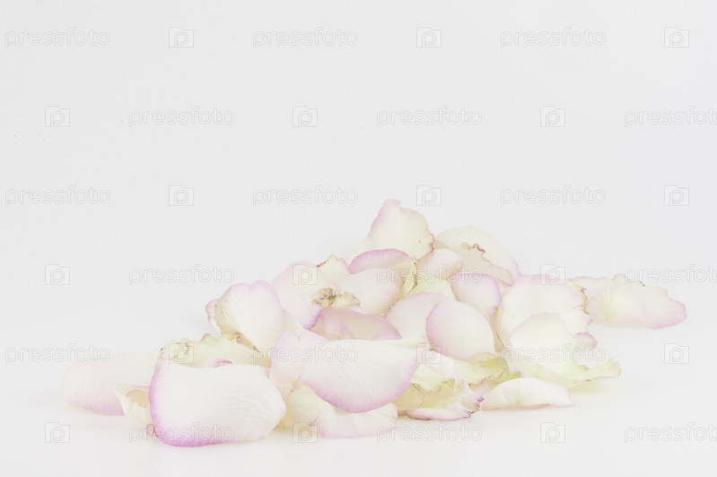 Лепестки розовой розы на белом фоне. Праздничная подарочная карта с копией пространства, макет