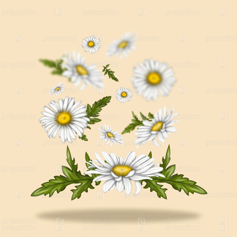Иллюстрация цветков ромашки. Цветы свободно парят в пространстве. Белые цветы на светлом фоне