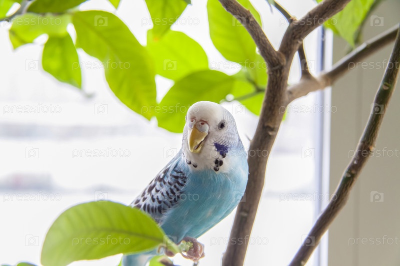 Красивый голубой волнистый попугайчик сидит без клетки на комнатном растении. Тропические птицы дома