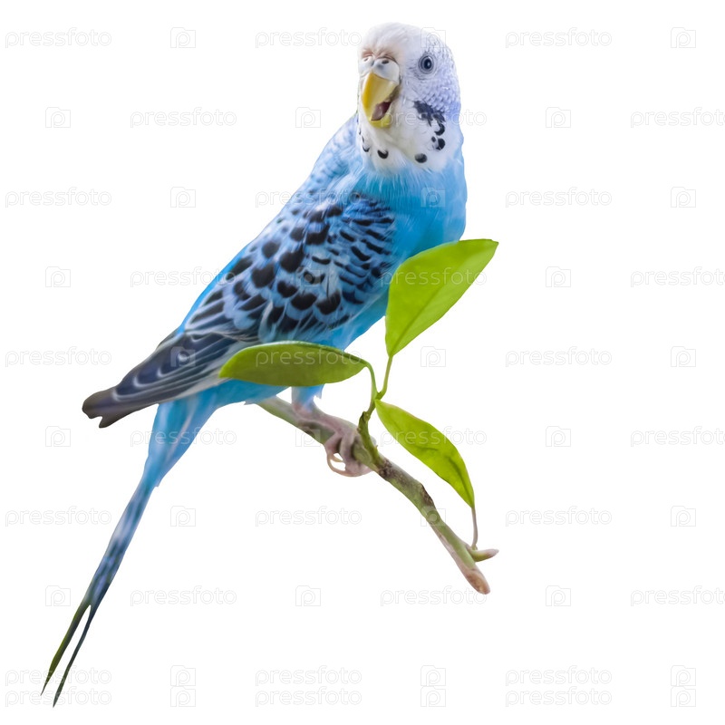 Красивый голубой волнистый попугайчик сидит без клетки на растении. Отдельный на белом фоне. Тропические птицы дома