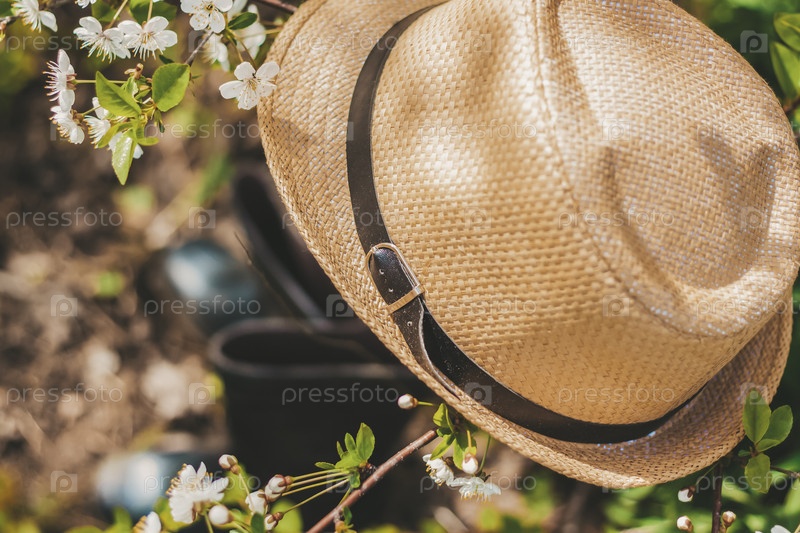 В саду на дереве с белыми цветками сакуры стоит садовая шапка, а под ней сапоги. Садоводство и садоводство,