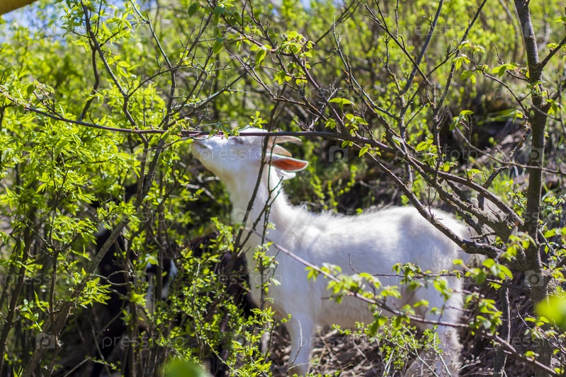Белая коза ест кусты на фоне зеленой травы. Дикая природа, животные