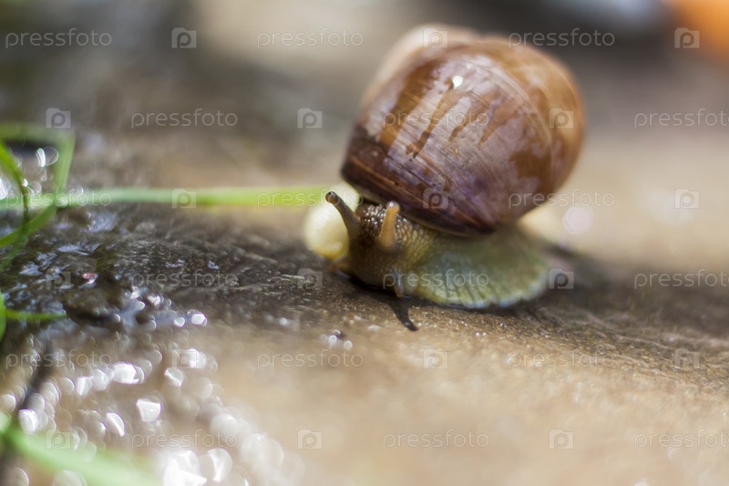 Крупные белые улитки-моллюски с коричневой полосатой раковиной, ползающие по камням на солнце. Улитка крупным планом в естественной среде,