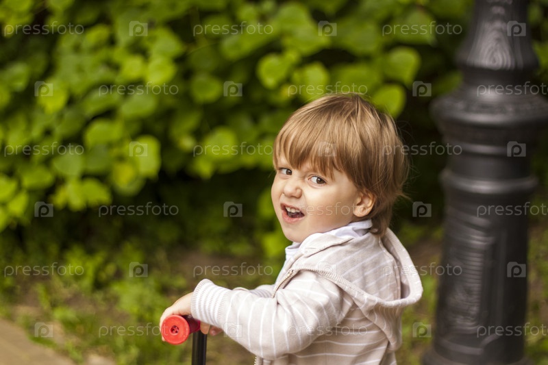 Дошкольник мчится на самокате по парку. Ребенок в парке в солнечную погоду. Мальчик весело гуляет в парке