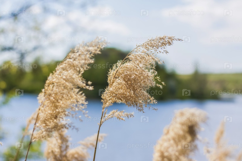 Пампасная трава на озере, тростник, семена тростника. Камыши на озере качаются на ветру на фоне голубого неба и воды. Абстрактный естественный фон. Красивый узор с яркими цветами