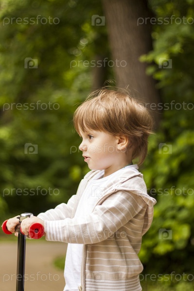 Дошкольник мчится на самокате по парку. Ребенок в парке в солнечную погоду. Мальчик весело гуляет в парке