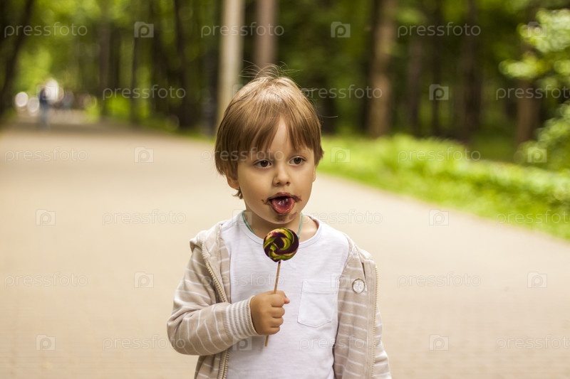 Портрет милого маленького мальчика, держащего большой круглый леденец на палочке. Младенец ест сладкий, большой леденец на палочке
