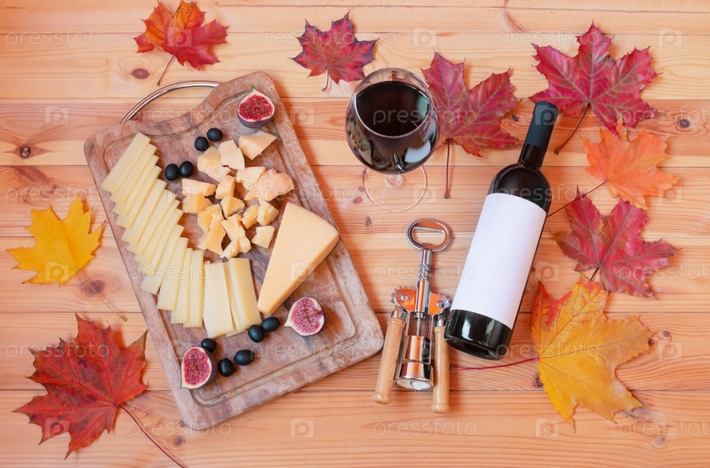 Стакан красного вина, бутылка красного вина, штопор, инжир, сыр и кленовые листья осени