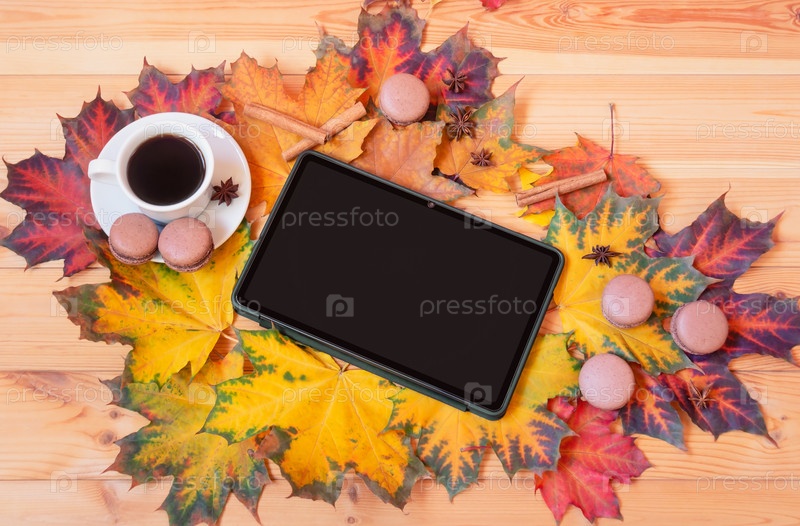 Осенняя композиция. Планшет, чашка кофе и осенние кленовые листья